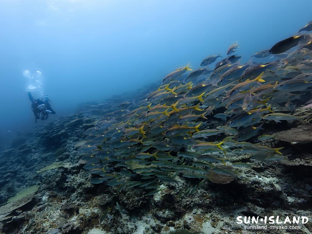その上をアカヒメジやノコギリダイの群れが優雅に泳ぎ回っていて、見ているだけで心が癒されます。