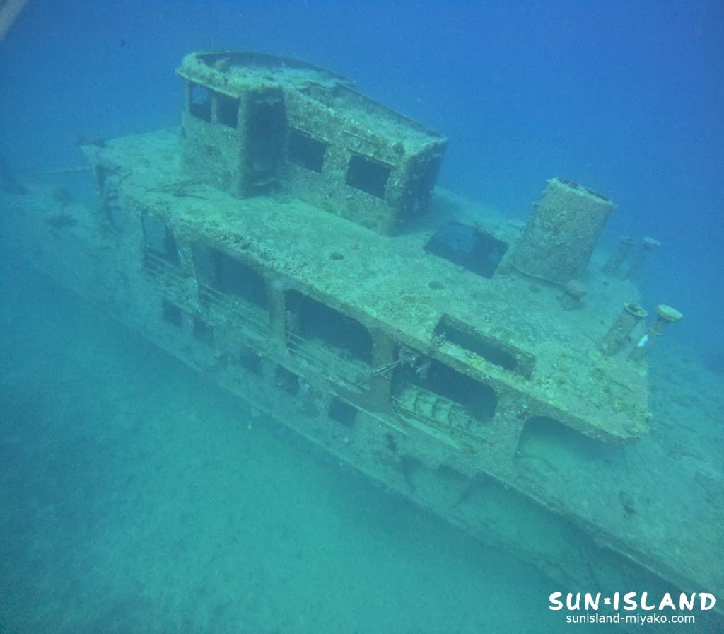 この『沈船』は、約30m程の大きなカーフェリーを魚礁目的で沈めたものでたくさんの魚たちが住み着いています。
