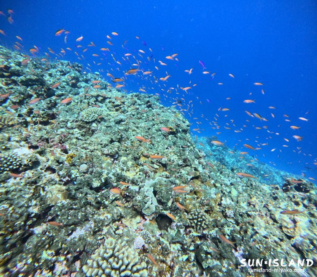 大きな魚で言えばアカククリやモヨウフグがよく見られ、小さい魚はイシヨウジやスズメダイ科の魚、ハナダイ科の魚たちなどなど色々な魚が見られるポイントになっています。