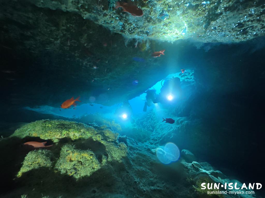 入口から出口がすぐには見えない構造になっているのが特徴で、水中ライトを片手に暗闇の中を進むダイビングは、まるで未知の世界へと足を踏み入れるようなドキドキ感が半端ない。