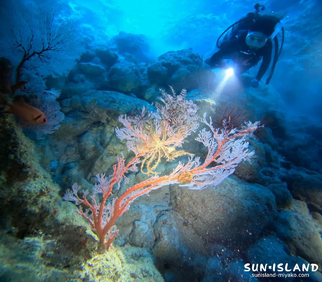 『魔女の部屋』では、穴の中で目が大きく真っ赤な魚の「アカマツカサ」や、樹木のように枝分かれしたサンゴの仲間「イソバナ」など赤色が非常に映える景色を楽しみましたよ。