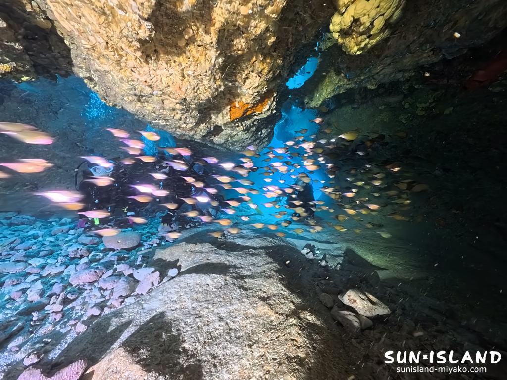 そして「魔女の部屋」は、天井が低く、より洞窟探検の雰囲気を感じられるスポット。狭い通路やオーバーハングを、宮古島 ダイビング 少人数制で丁寧にクリアしていきます。ここでは、外の荒れた海況とは無関係に静かで穏やかな水域が広がっており、お客様も、この複雑な地形の面白さに夢中になっていらっしゃいました。