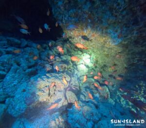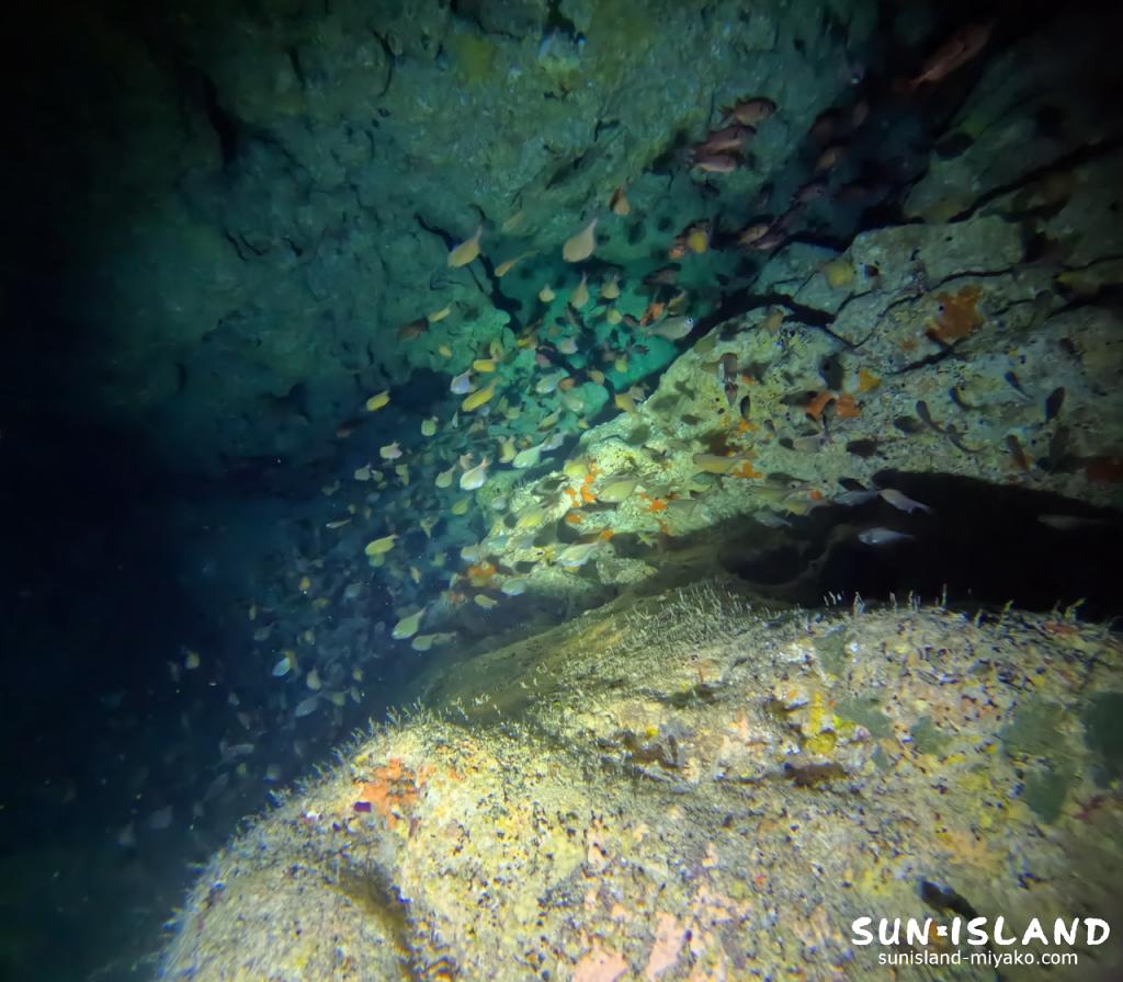 『ツインケーブ』では、宮古島の洞窟ではお馴染みのアカマツカサやミナミハタンポ、リュウキュウハタンポの群れを見ながら水中ライトを頼りに細長い洞窟探検を楽しめましたよ。