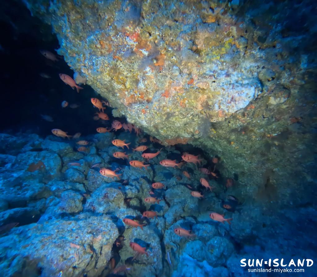 狭い洞窟で群がっているハタンポたちに水中ライトを当てるとキラキラと反射しながら、ライトから逃げ惑う姿は非常に可愛らしく見応え抜群でした。