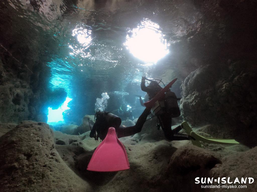 伊良部島ダイビングスポットの中では、入口から出口は見えず、手狭で真っ暗な洞窟探検を楽しめます。