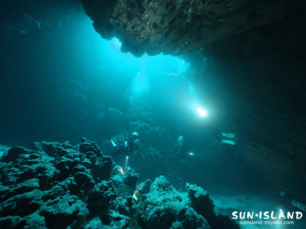 入口から出口がすぐには見えない構造になっているのが特徴で、水中ライトを片手に暗闇の中を進むダイビングは、まるで未知の世界へと足を踏み入れるようなドキドキ感が半端ない。