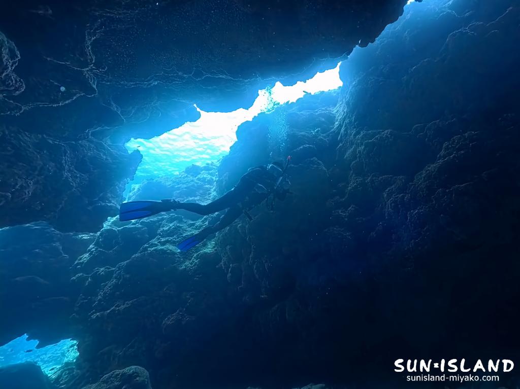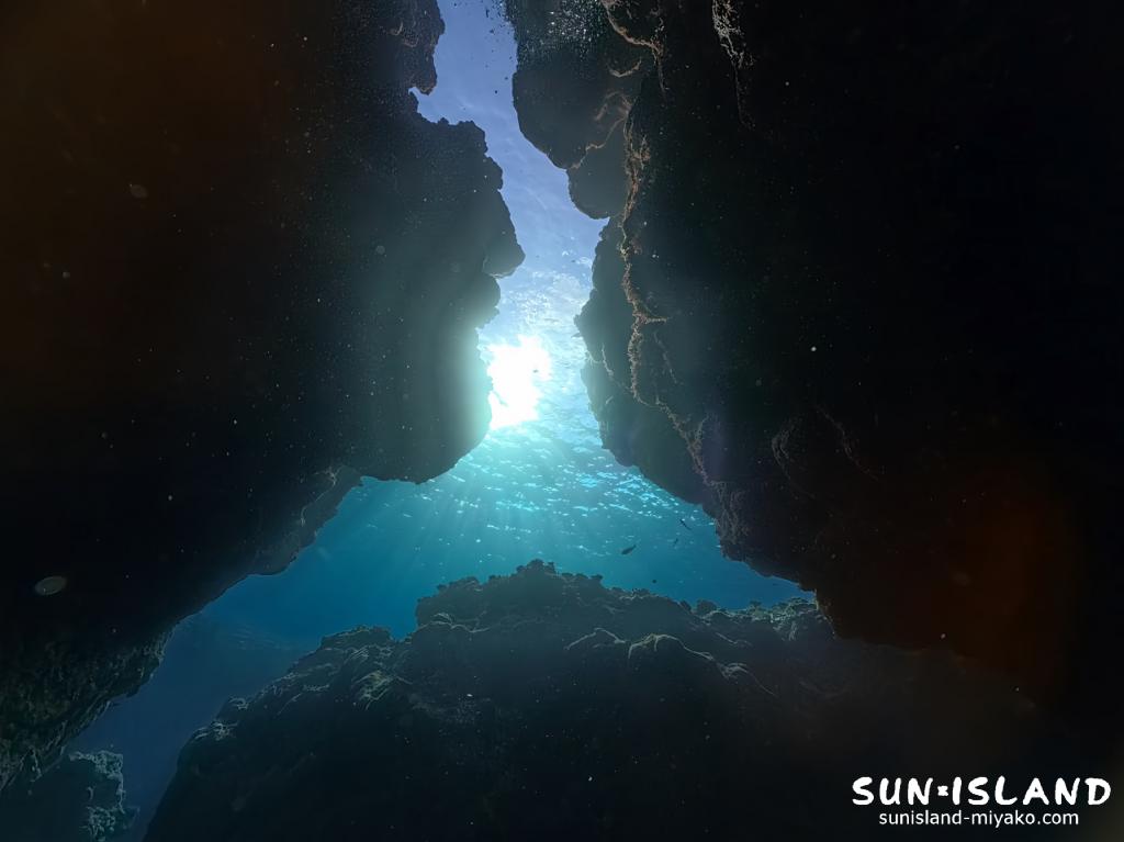 クレパスの両脇の黒に光が映え、王道の宮古島ダイビングならではの地形造形美に、Mさんと見惚れてしまいました~。